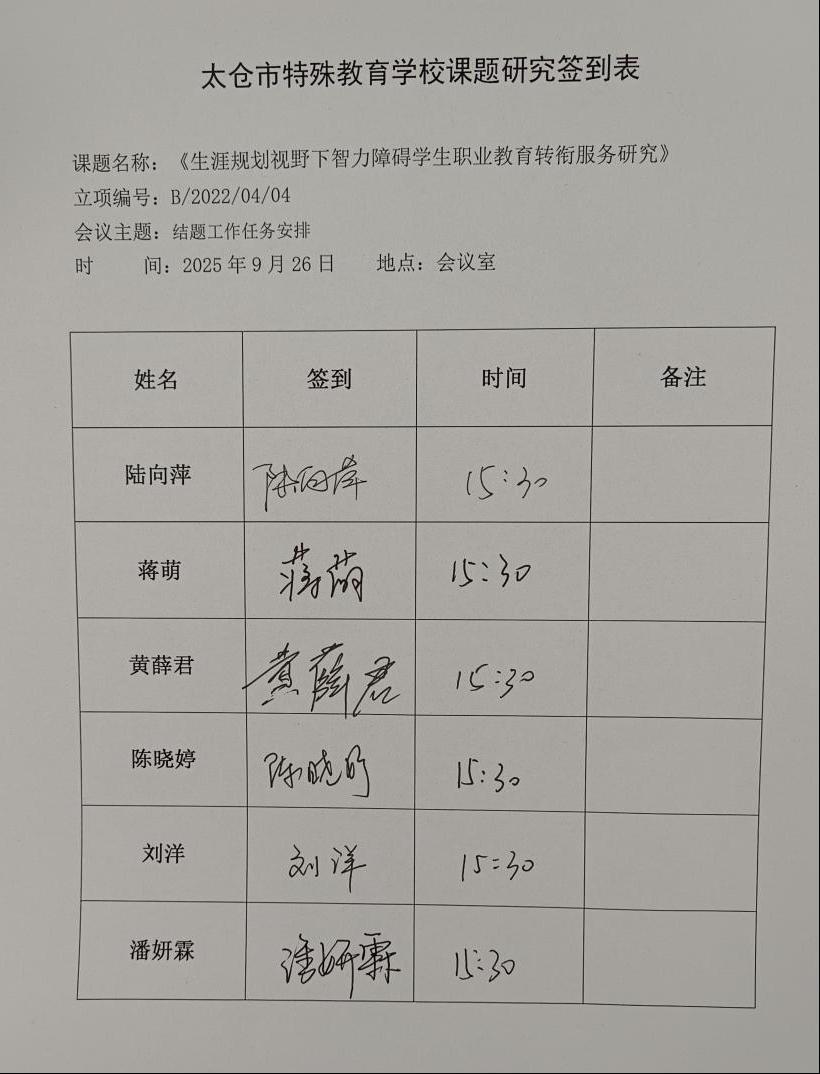 2025年9月26日,省级重点课题《生涯规划视野下智力障碍学生职业教育转衔服务研究》结题工作推进会在学校会议室顺利召开。课题主持人及全体核心成员(陆向萍、蒋萌、黄薛君、陈晓婷、刘洋、潘妍霖)出席了本次会议。此次会议标志着为期三年的课题研究正式进入成果总结与凝练的关键阶段。